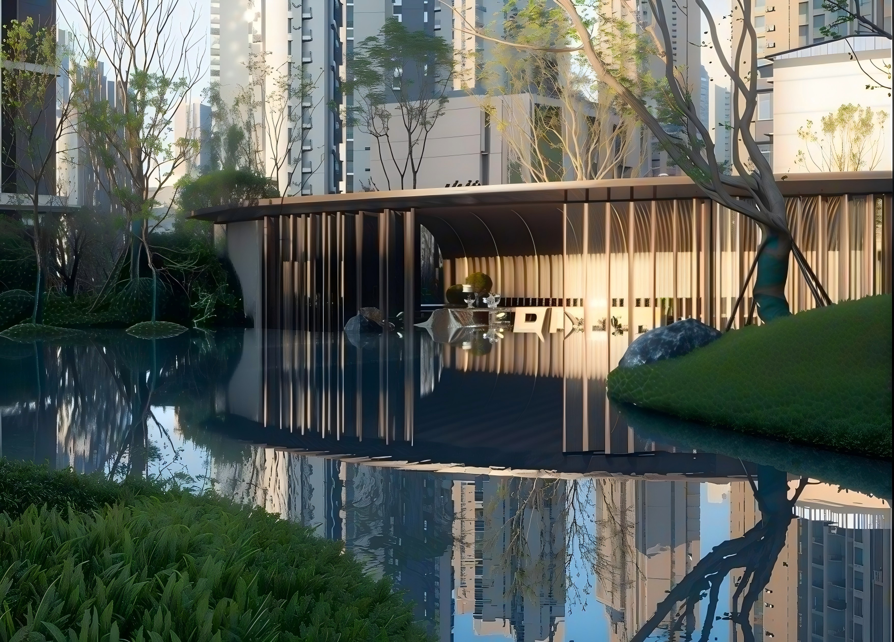 以现代手法转译东方文化内核, 营造房景相融、尊贵雅致的 庭院式归家的首重空间。 利用欢聚时光、社区会客厅及架空层空间, 结合季相分明的多层次植物种植, 打造共享互动的家庭式社交宜居景观。